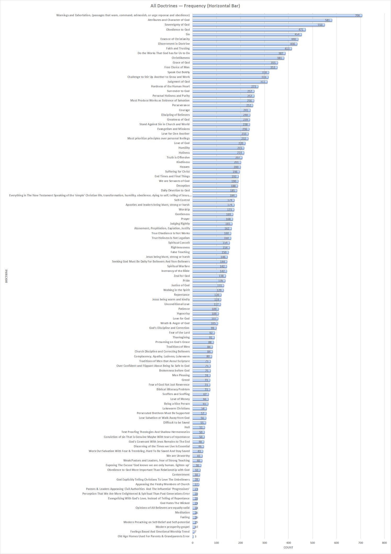 These are the 121 Doctrines/theologies: Christlikeness Complacency, Apathy, Laziness, Lukewarm Contentment Courage Daily Devotion to God Deception Difficult to be Saved Discernment in Doctrine Discipling of Believers Evangelism and Missions Faith and Trusting Fasting Fear of the Lord Free Choice of Man Gentleness God’s Discipline and Correction Hardness of the Human Heart Heaven Hell Humility Judging Rightly Judgment of God Justice of God Love for God Love for One Another Love of God Love of Money Meditation Obedience to God Patience Perseverance Personal Holiness and Purity Prayer Pride Repentance Righteousness Self-Control Sin Sovereignty of God Speak Out Boldly Spiritual Warfare Suffering for Christ Surrender to God Thanksgiving Walking in the Spirit Warnings and Exhortations We are Servants of God Worship Wrath & Anger of God Apostles and leaders being blunt, strong or harsh Attributes and Character of God Being a Nice Person Brokenness before God Challenge to Stir Up Another to Grow and Work Church Discipline and Correcting Believers Do the Works That God has for Us to Do End Times and Final Things Essence of Christianity False Teaching Grace of God Greatness of God Greed Holiness Hypocrisy Jesus being blunt, strong or harsh Kindliness Lose Salvation or Walk Away from God Must prioritize principles over personal feelings Must Produce Works as Evidence of Salvation Scoffers and Scoffing Traditions of Men We are Unworthy Zeal for God Jesus being warm and kindly Appeasing the Fleshy Members of Church Atonement, Propitiation, Expiation, Justify Biblical illiteracy Problem Christians Not Vote For Immoral Supporting Politicians (i.e., Abortion) Church Projects Exciting, Trendy Church to Attract Saved And Unsaved Error Conviction of sin That is Genuine Maybe With tears of repentance Discerning of the Times we Live Is Essential Evangelizing With God’s Love, Instead of Telling of Repentance Everything in The New Testament Speaking of the 'simple' Christian life, transformation, humility, obedience, dying to self, telling of Jesus, etc., to expose the Modern Preaching of a 'Trendy' Appealing, Popular, Hyper-Faith, Type Christianity Today Exposing The Excuse 'God knows we are only human, lighten up’ Fear of God Not Just Reverence Feelings Based And Emotional Worship Trend God Explicitly Telling Christians To Love The Unbelievers God Hates The Wicked God's Covenant With Jews Remains to The End Immoral TV & movie viewing Inerrancy of the Bible Lukewarm Christians Men Pleasing Mid-Tribulation Rapture Modern Constant Affirming Encouragement - You Are Favoured Modern Preaching on Self-Belief and Self-potential Modern prosperity gospel Not Talk About Politics In Church Error Obedience to God More Important Than Relationship with God Old Age Homes Used For Parents & Grandparents Error Opinions of All Believers are equally valid Over Confident and Flippant About Being So Safe In God Pastors & Leaders Appeasing Civil Authorities And The Influential ‘Progressives’ Perception That We Are More Enlightened & Spiritual Than Past Generations Error Persecuted Brethren Must Be Supported Post-Tribulation Rapture Presuming on God's Grace Pre-Tribulation Rapture Seeking God Must Be Daily For Believers And Non-Believers Spiritual Conceit Stand Against Sin in Church and World Text Proofing Theologies And Shallow Hermeneutics Traditions of Men that Annul Scripture True Holiness Is Not Legalism True Obedience Is Not Works Truth is Offensive Unconditional Love Weak Pastors and Leaders, Fear of Strong Teaching Work Out Salvation With Fear & Trembling, Hard To Be Saved And Stay Saved Youth are Now Favoured in Our Churches Error Youth Groups And Children’s Church Not Biblical